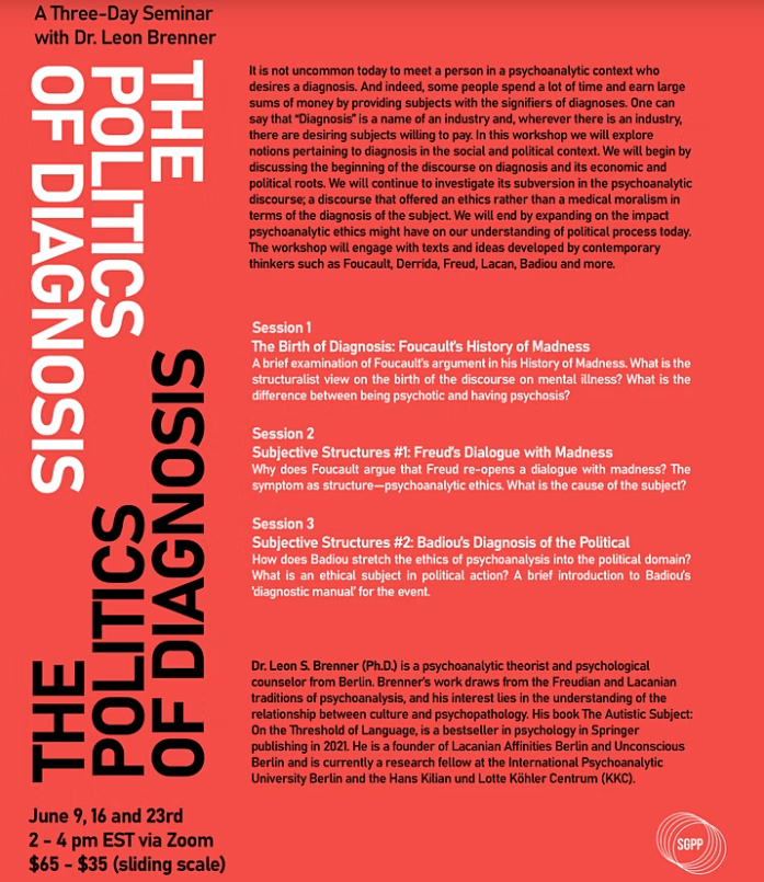 This week, in collaboration with Study Groups on Psychoanalysis and Politics, we start a three-day workshop on the historical, political and social dynamics involved in diagnosis. The workshop will take place every Thursday 8pm Berlin time for the next three weeks via Zoom. Here is a short blurb about the workshop with a list of topics: