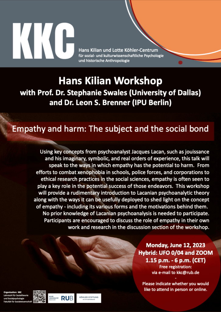 Using key concepts from psychoanalyst Jacques Lacan, such as jouissance and his imaginary, symbolic, and real orders of experience, this talk will speak to the ways in which empathy has the potential to harm. From efforts to combat xenophobia in schools, police forces, and corporations to ethical research practices in the social sciences, empathy is often seen to play a key role in the potential success of those endeavors. This workshop will provide a rudimentary introduction to Lacanian psychoanalytic theory along with the ways it can be usefully deployed to shed light on the concept of empathy – including its various forms and the motivations behind them. No prior knowledge of Lacanian psychoanalysis is needed to participate. Participants are encouraged to discuss the role of empathy in their own work and research in the discussion section of the workshop.